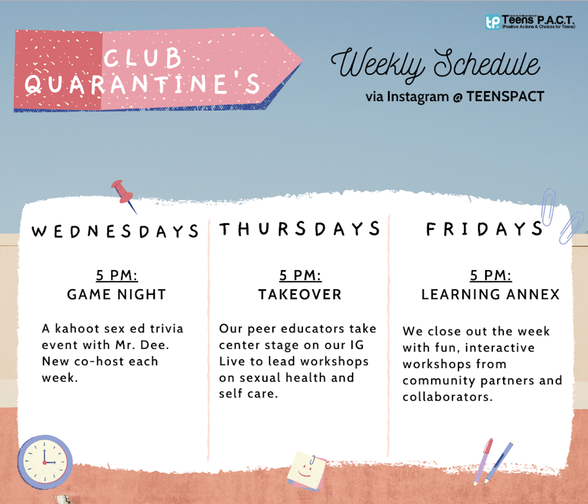 Club Quarantine's FREE events will take place on either @TeensPACT's IG Live or on Zoom.